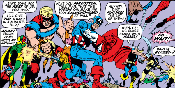 Buscema is truly a versatile artist in terms of presentation, able to craft action-filled panels as well as more dramatic scenes meant to have an impact. As you saw with The Defenders, a double-page spread can be perfectly suited to conveying dramatic impact, at the right time. Have a look at this pivotal scene from The Avengers, where Kang the Conqueror has imperiously brought the Avengers into his own century in order to involve them in a contest with himself and the Grandmaster: