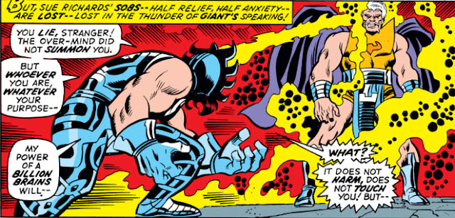 The thing about revenge is that it can unfortunately spawn a cycle of revenge--and the Eternals, though hardly the victims here, decide that their final revenge is going to be not just on the ones responsible for their destruction, but on the entire universe. And so they created the Over-Mind, the sum total power of a billion brains collected into one matchless warrior of the Eternals. And when the Over-Mind awakens after his long incubation and launches his assault on Earth in earnest, his conquest is interrupted by a surprise appearance of the last character we expected to see in this battle: