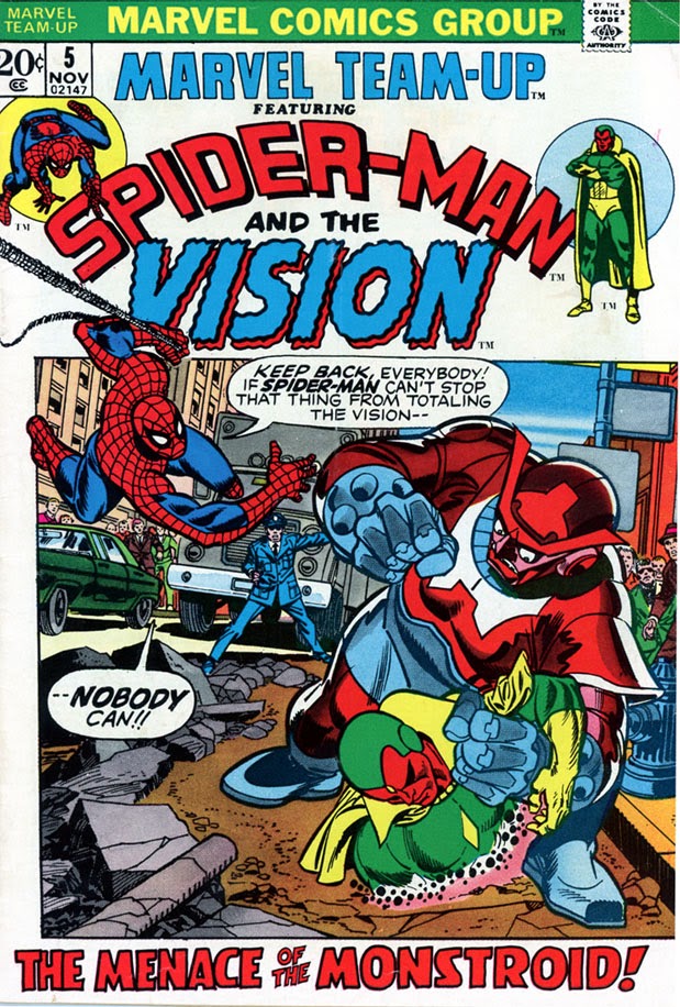 The flip side of Marvel Team-Up is that, regardless of the conflicting feelings it gave you of seeing Spider-Man team up with someone on a regular basis, its cover marquee was always eye-catching and couldn't help but pique your curiosity. I think this issue is the first I recall of the Vision's name being part of a masthead, as well as having his name distinguished with a title style. There was also the fact that, unlike the Human Torch and the X-Men, who appeared in the prior four issues, the Vision was a character whom Spider-Man had never met before, which would give this story a little extra development to feature. And since this is the Vision, writer Gerry Conway and artist Gil Kane begin this story by making his first impression with Spider-Man a memorable one: