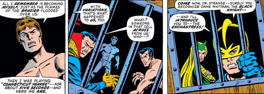 Within the castle, however, there is no sign of the Hulk, or of Barbara, or even the Knight--and as the castle's mystic brazier unexpectedly flares into life, Strange and Namor find themselves transported to another realm, to face a reception committee bent on their capture. Overwhelmed, and unceremoniously tossed into holding cells, they join Barbara, Bruce Banner, the Knight--and one other.