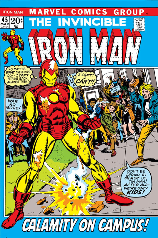 (Get a good look at that campus where Iron Man is getting pelted with rotten fruit and molotov cocktails, because this story doesn't go anywhere near a campus; instead, it takes place entirely on the grounds of Stark's factory. The cover to the story's conclusion in the following issue hits much closer to the mark.)