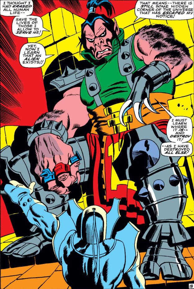 Thankfully, Lee and artist John Buscema don't linger on the wasteland of Earth's surface and allow the Surfer to mourn our fate overlong with what might amount to I-told-you-sos; given the Surfer's short time on our world, and the fact that he's established few ties to its people to speak of, he's really said all there is to say in these brief scenes. The greater story awaits--though, again, we might find that there's another reason Lee chooses to spend only minimal time with this aspect of it.