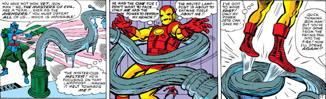 At any rate, Iron Man has battled the Melter enough to know not to face him head-on--and thanks to the battle taking place on the city's streets, he needs only a few carefully-chosen words to have the Melter defeat himself.