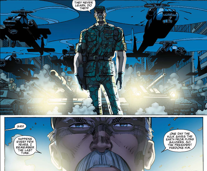 With two strikes against the Hulk, it goes without saying that each of the presidential orders of amnesty had been premature; and matters certainly didn't improve with the events of World War Hulk, when Ross received a communique from the White House voicing much different sentiments this time. And in response, Ross brings himself full circle.