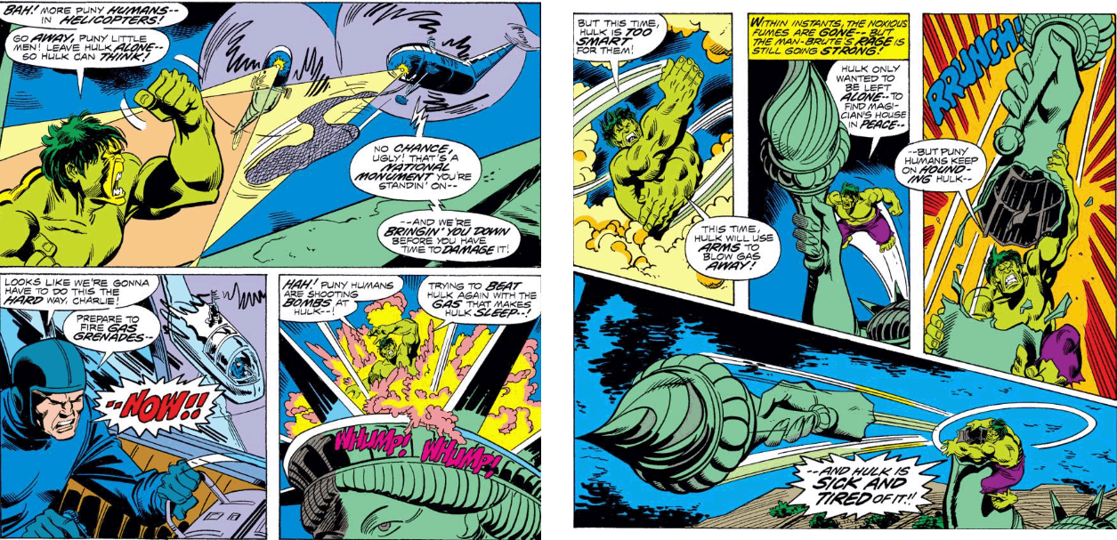 Reaching New Jersey, the Hulk spots the Statue of Liberty and leaps to it in order to gain an optimal vantage point for his search. But fearing damage to the monument, the N.Y.P.D. attack the Hulk on sight--and the damage they sought to avoid becomes unavoidable, not only for the statue but also for themselves.