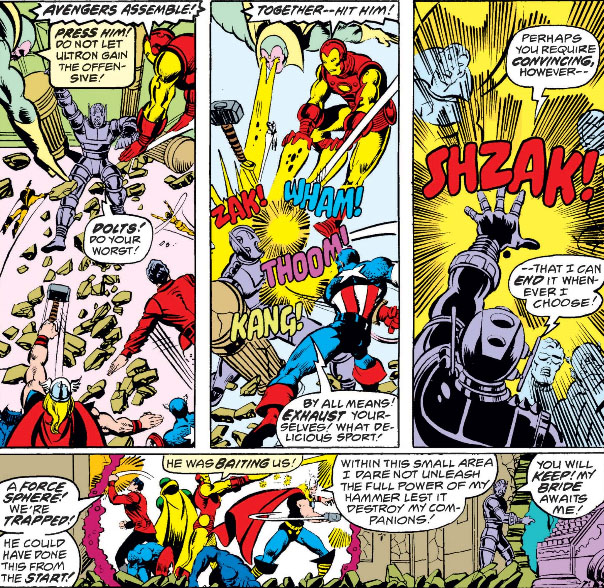 I reas this years ago before I got big into the Avengers or knew who Ultron was the scene where the Avengers burst into Ultron's chambers where he seems to be playing a piano then Yellowjacket threatens him and calls him names cause his weapons dont work anymore confused me as a kid, just who was the bad guy here Ultron minding his own business or this aggressive Yellowjacket and then all the Avengers go hell bound to KO the Ultron. I must have wondered what this poor robot had done to earn such abuse but then I hadnt read any previous Ultron/Avengers tales.