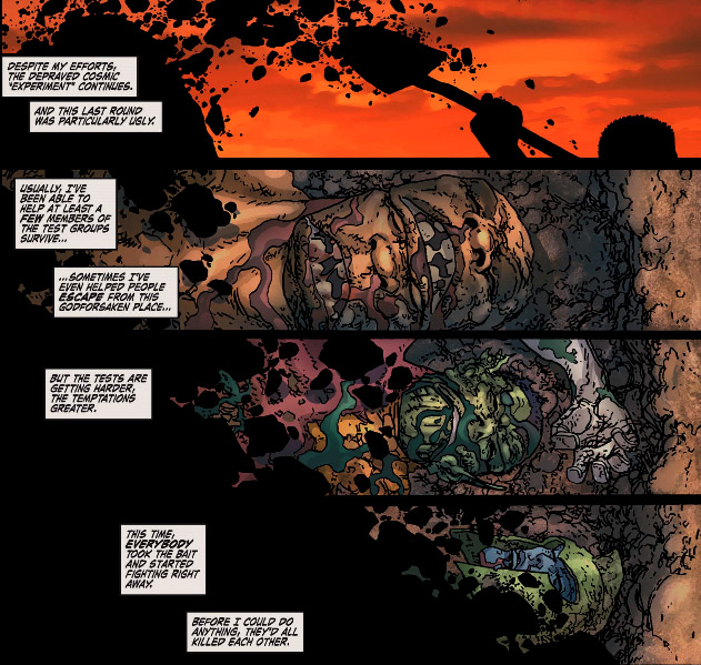 It's high time, as well, that Michael go into detail about his own presence here, so that the others have some inkling as to what exactly is going on and how they proceed from here. The information he provides is startling: living on this planet for years, while watching these contests play out with hundreds of superbeings and then left to bury the corpses of those who didn't survive. (His own group was about as diverse as they come: Captain Marvel (Monica Rambeau), Wonder Man, Darkhawk, Dracula, Terror, Coldblood, and Sleepwalker.