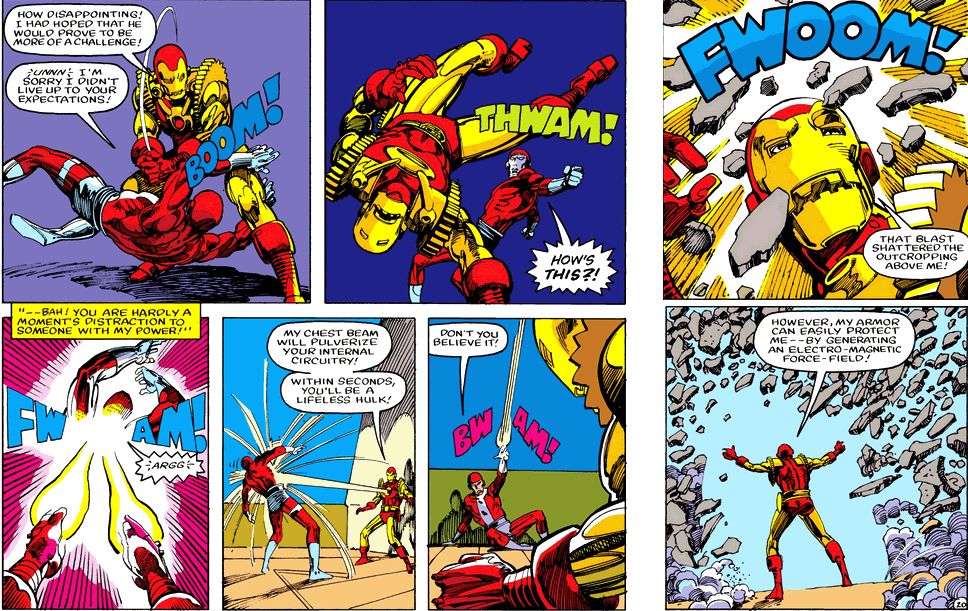Iron Man vs. Machine Man would seem to be a natural match--more so to the latter, who first seeks out Iron Man in early 1983 (when the armor is still worn by Tony Stark) on the assumption that Iron Man is a robot like himself. Unfortunately, Stark at this point in time had fallen hard off the wagon and was thoroughly inebriated--and Machine Man's overtures are met with hostilities, as Stark jumps to the conclusion that this robot is another flunky of his nemesis, Obadiah Stane, sent to bedevil him.