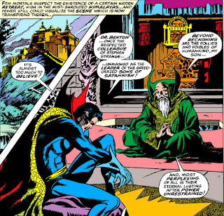 Benton's frankness is an interesting base for writer Roy Thomas to cover, since there would likely have been some in medical circles (granted, not many) who might have sought out Strange as Benton has and attempted to bring him back into the fold in some capacity. But there is more to Benton's entreaties than the thought of letting Strange's skills go to waste, as we'll see.