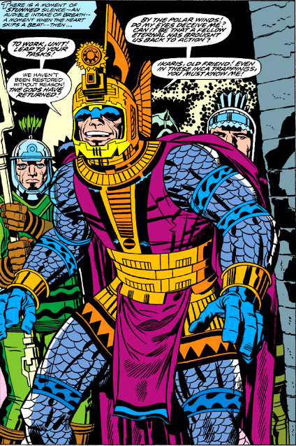 Scorpio's scheme this time is to cast a mask that allows him to impersonate Fury within SHIELD, and then arrange for Fury himself to replace a Life Model Decoy unit scheduled to be tested in a deadly chamber of fatal traps--nor do Fury's fellow agents realize the LMD is their leader, given that the face is masked (then pull it back, Fury--even I knew that!) and they're aware that the unit was programmed with Fury's own reactions and reflexes. Clearly Scorpio has an axe to grind with Fury that involves stress and suffering rather than killing the man when he was unconscious and helpless.