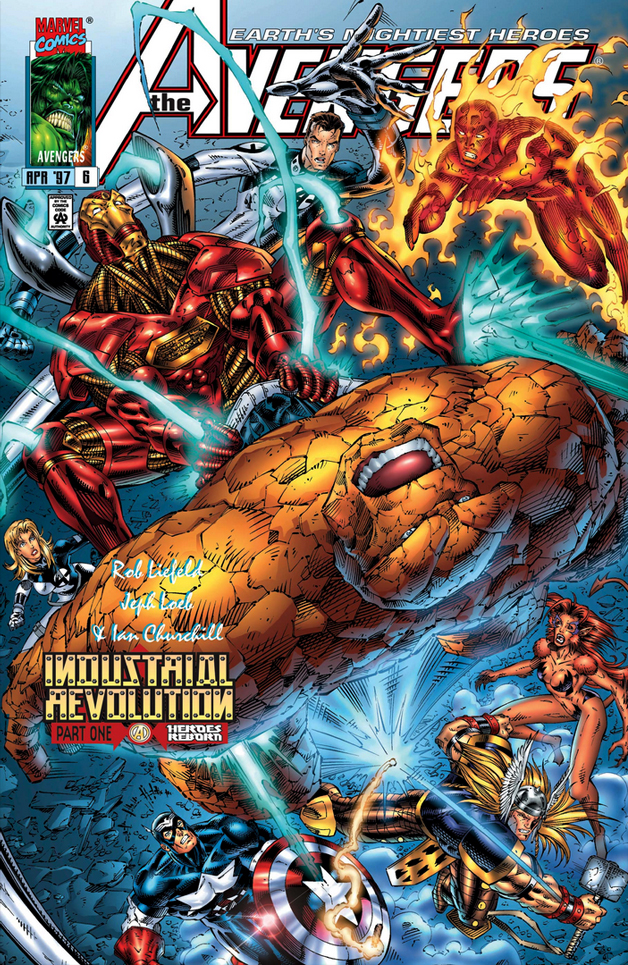 April finds each of these titles in its sixth issue, where, alternate world or not, all have discovered the time-tested and lucrative advantage of a crossover story--namely, "Industrial Revolution" (don't forget to invert the letter "n"), where the reactor core of the now-in-ruins Avengers Island is in danger of a meltdown which would irradiate most of the United States. Aside from the obvious historical context, it might seem at first perplexing as to where the "revolution" part comes into play; but while the crisis acts to draw the heroes of all titles together, the story also flashes back to the formation of a group of "eggheads" (as Ben Grimm would refer to them--Bruce Banner, Victor Von Doom, Connor "Rebel" O'Reilly, Anthony Stark, and Reed Richards) who would work to "protect the world from its own basest instincts" and "wield power for the benefit of all mankind," baseline goals which Henry Pym jokingly refers to as the group's "industrial revolution." (Pym seems to be omitted from this group--maybe that's a good idea, though it feels like a better fit overall with just the five of them.)