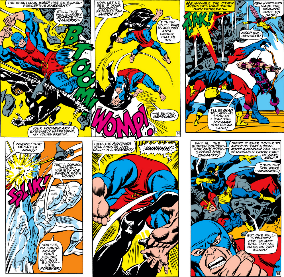 It's hard to get thru. Avengers in this era did nothing but argue. Differences of opinion, contentious debates, vigorous disagreements...all fine and acceptable. These muscle-clenched, nose-to-nose, spiky word balloon rage matches are pretty tedious. They just use up valuable page real estate to no purpose. I'd much rather see more panels of X-Men vs Avengers than a pointless slapfest between our "heroes".