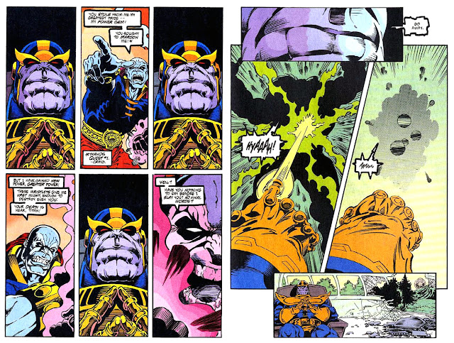 (Gee, whatever happened to Thanos's eye-beams, which once had even Thor on the ropes? Was that strictly a Jim Starlin penchant? Yet let's bear in mind that Thanos's goal here appears to be to goad his opponent, which we'll see the result of shortly.)
